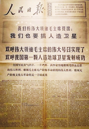 1970年4月27日的《人民日报》头版刊登了中国第一颗人造地球卫星发射成功的消息。