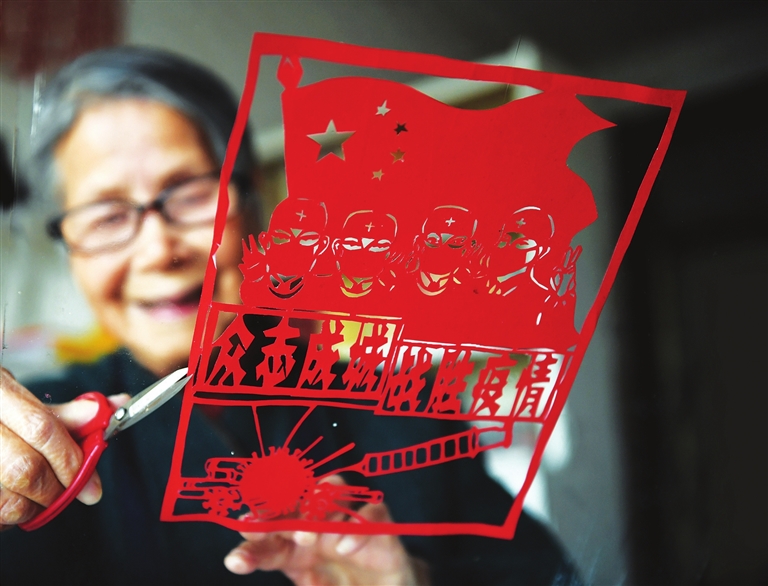 1月22日,家住劲松社区的关玲老人,正在创作自己的剪纸作品,向疫情防控一线的战士致敬,为抗疫加油鼓劲。90岁高龄的关玲老人创作了几十幅抗疫系列剪纸作品,通过微信群、社区报、公众号在劲松社区流传开来,传递一份力量和支持。 全媒体记者 米国伟 摄