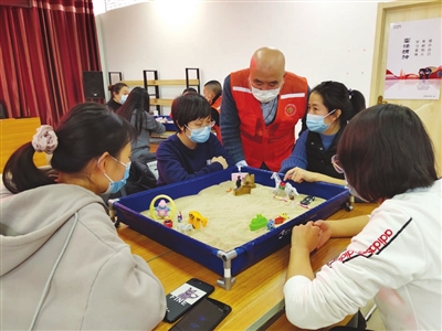 跟着节奏明快的音乐轻松舞动,释放内心的焦虑和担忧……当天下午,开场的热身活动使社区工作人员露出舒心的微笑。随后,心理科普志愿者苏延恒带领大家坐下来摸沙,在沙子的细腻触感中,大家的心情舒缓下来。