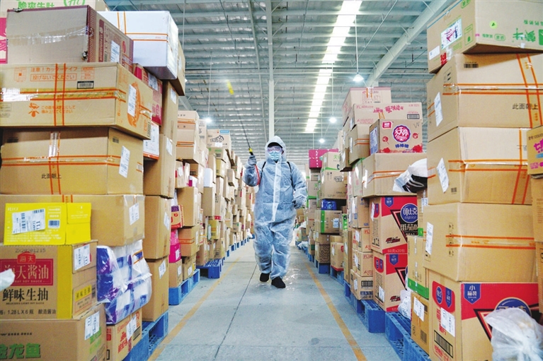 1月23日,菜鸟网络石家庄公共分拨中心工作人员在对快递包裹进行消杀。
