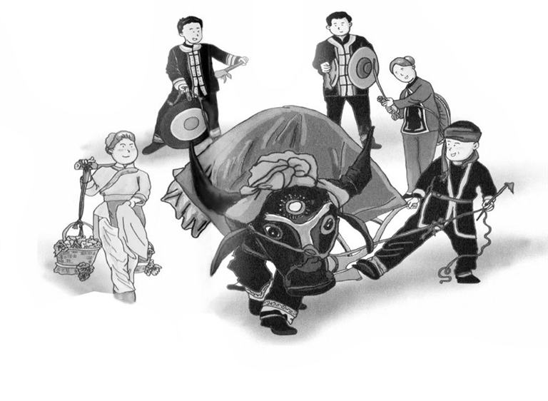 广西岑溪有个剧种就叫牛戏,也叫牛娘剧、牛娘戏,起源于中国祖先的春牛崇拜,是一种由舞春牛娱神活动发展起来的地方戏曲,是全国独一无二的地方剧种。舞春牛是两广多地汉族春节期间的一种民俗游艺活动。牛身用竹片编织而成,黑布或灰布做套;绵纸做头和角,画上中眼。两人一头一尾钻入布套中,边唱边舞;一人头包毛巾,手扶犁架跟在后面,做犁田状;其他人或提灯笼,或敲锣鼓,或领唱春牛歌。清乾嘉时期岑溪出现了牛娘戏班,至今已有两百多年历史,是一项宝贵的非物质文化遗产。
