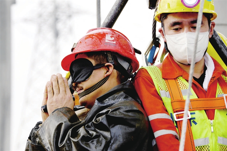 3人、3人、2人、2人,随着吊桶的一次次往返,被困人员陆续回到地面。最后一趟,一名获救矿工朝着掌声传来的方向,双手合十,表示感谢。
