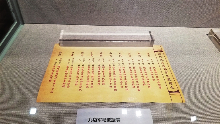 晋商博物院展品《明代九边镇军马数据表》显示:九边镇驻扎86万军队,34万匹战马:辽东军官94693人,马77001匹;蓟州军官85546人,马21830匹;宣府军官151452人,马55274匹;大同军官135778人,马51654匹;山西(太原)军官135778人,马51654匹;延绥军官80196人,马45940匹;宁夏军官71693人,马22182匹;固原军官126919人,马32250匹;甘肃军官91571人,马29318匹。合计军官863135人,马342000匹。