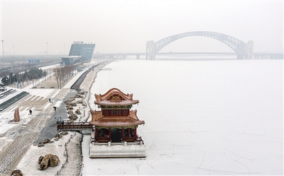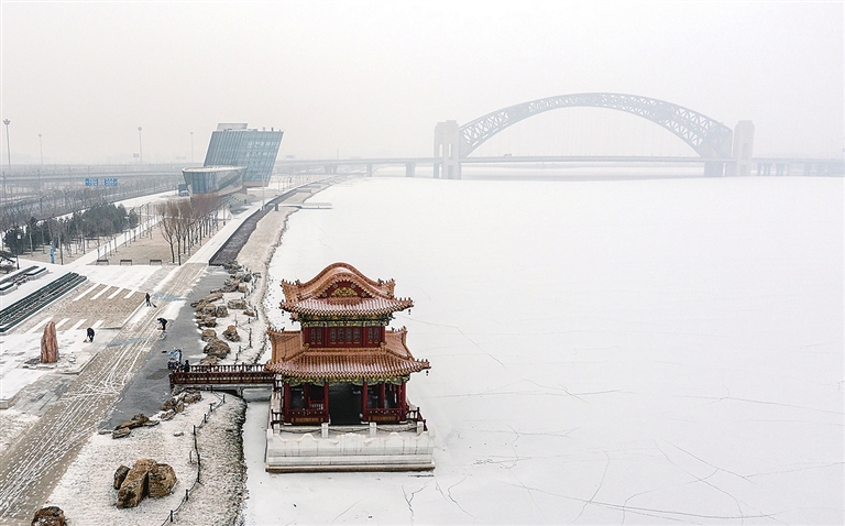 1月25日清晨,雪中的汾河景区。当日,我市迎来降雪天气,为干燥的空气增添了几分湿润.虽然这场雪下得并不大,但对缓解旱情和冬作物的保墒有着重要的作用,同时也带给市民一份期待已久的冬日惊喜。 韩双喜 柴杰梁 摄