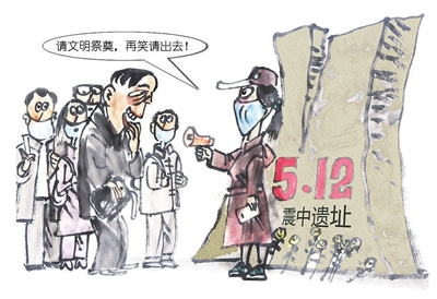 1月24日,网友爆料称,在四川汶川县映秀镇映秀震中遗址,有几名游客在参观过程中不停说笑。导游看到后怒怼:“请文明祭奠,如果再笑请你出去!”(中新网1月25日)
