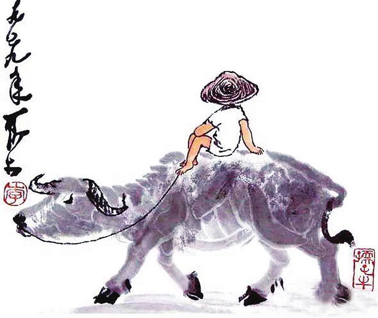 我喜欢他的《牧牛图》,性格温顺的老牛与天真无邪的牧童和谐相处于画图之中,背景又是如此绚丽多彩,或春风杨柳,或枫叶如火,或鸦阵归飞,或烟雨远山。他所创造的水牛形象表现了一种民族的精神气质,脚踏实地,默默奉献。他以高超的笔墨技法,概括地表现出水牛的千姿百态,或行或止,或立或卧,或正或侧,无不栩栩如生,而且特别注重细节的真实性,比如“牛鼻子确实画成了像是湿的”,体现出“牛鼻子有水汽”的意味。而那些牧童,嬉戏而乐,天真烂漫,抒发了人类在更高的层面上重返童年的期待,以及“俯首甘为孺子牛”的题旨。这些《牧牛图》意境开阔,在构图和造型上点、线、面的对比与交织,泼墨、积墨浓淡干湿的变化与渗融,加上生动、准确的细节刻画,堪称是一幅幅经典。李可染在这些画图上,往往题款多多,从不同角度来歌颂牛的品德。如“给予人者多,取与人者寡”;“牛也力大无穷,俯首孺子而不逞强,终生劳瘁事农而不居功……”诚哉斯言。