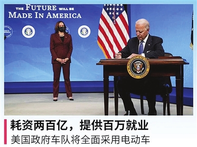 拜登同时重申在去年竞选期间宣布的计划,打算把联邦政府所有公务用车替换为美国产电动汽车。美国媒体估计,联邦政府现有公车大约64.5万辆,其中美国邮政局的邮车最多。不过,白宫方面还没有制定时间表。
