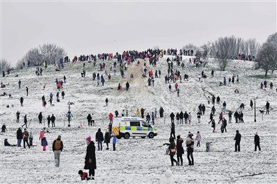 1月25日,在英国伦敦的普里姆罗斯山,人们在覆盖着积雪的草地玩耍。当日,英国多地迎来降雪天气。 新华社 发