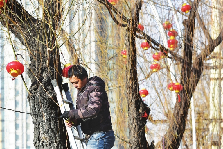 临近春节,街头树梢彩灯高悬,浓浓年味儿扑面而来。1月27日,省城街头,工作人员正在加紧悬挂彩灯,营造喜庆的节日氛围。 邓寅明 摄