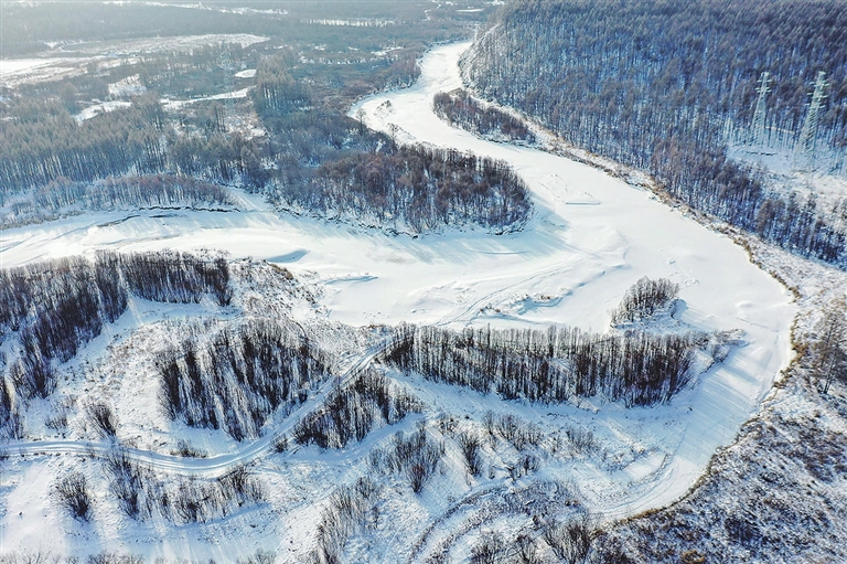 1月27日,大兴安岭深处的根河被白雪覆盖(无人机照片)。