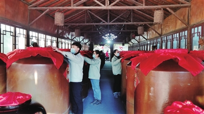 员工正在检查醋储量。