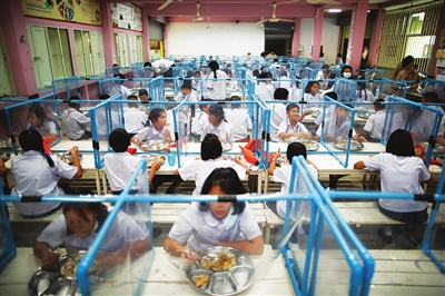 2月1日,泰国曼谷一所学校的学生在设有透明挡板的餐桌用餐。泰国部分停课的学校于2月1日起开学复课,但仍须严格遵守防疫规定。新华社 发
