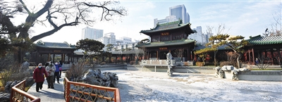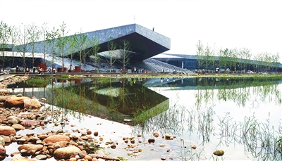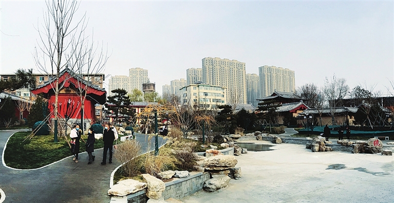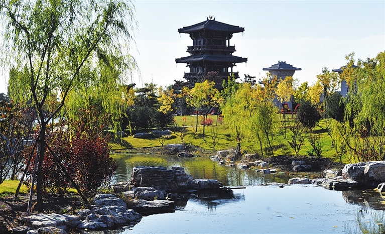 西区为游客休闲服务区。以园林建筑景观为基础,形成开放式区域游园,叠山理水、植树造景,打造集休闲餐饮、文创产品、工艺展示于一体的服务空间。通过唐、宋、元、明、清等五个朝代代表性建筑及非遗产品代表推光漆、瓷板画、木雕、麦秸画、珐华瓷、澄泥砚等,尽现山西传统工艺之绝美,让游客在休闲中感受山西厚重的历史文化。