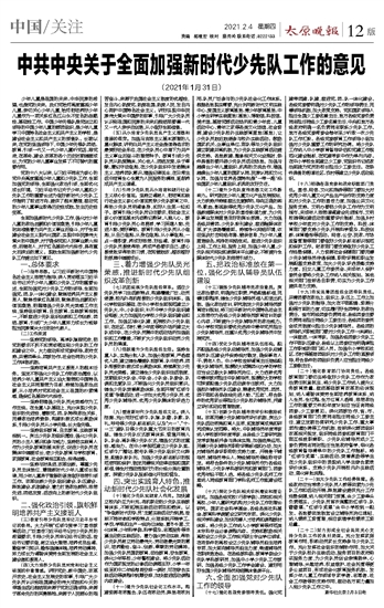 中共中央关于全面加强新时代少先队工作的意见