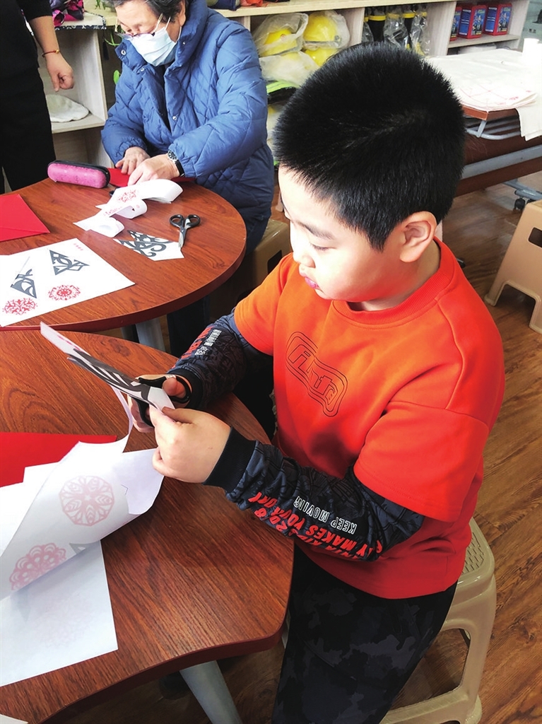 当天上午,孩子们来到社区,一一接受了体温测量、消毒和登记。“剪纸是我们的传统民俗活动,我们小时候,每到小年,除了吃糖瓜,还会跟着家里的老人剪窗花、贴窗花……”老师简短介绍后,给孩子们分发了剪纸模板,开始教大家剪窗花。