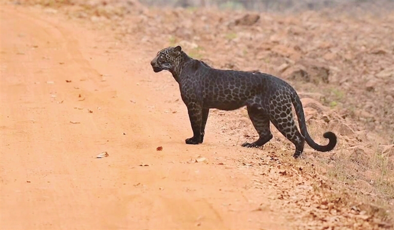 印度公园罕见黑豹 浑身布满闪亮黑斑