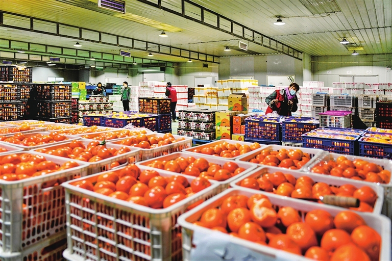 2月5日,太原市鸿新农产品有限公司的仓库内,工人们正在熟练地对果蔬进行分拣、称重、装载,送往千家万户。随着春节临近,鸿新公司每日配送出货量数百吨,有力地保障了菜价平稳,惠及广大市民。 全媒体记者 米国伟 摄