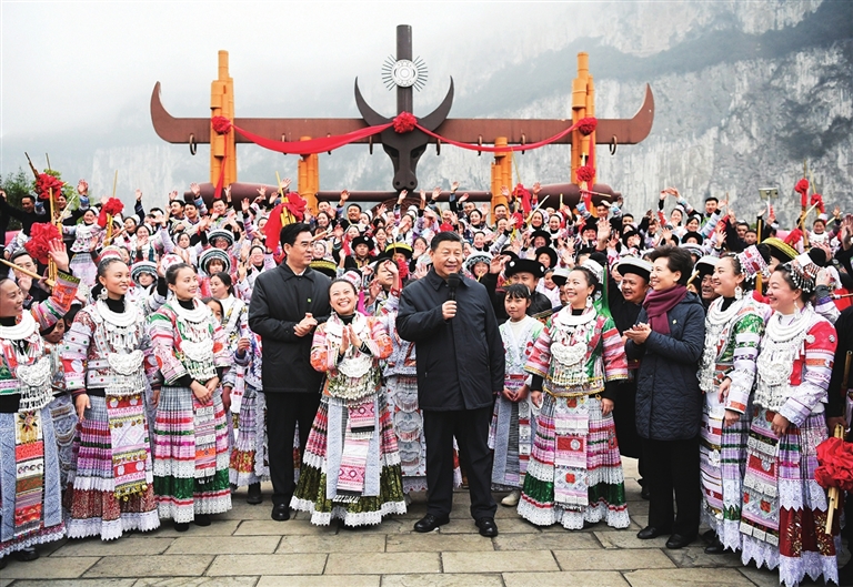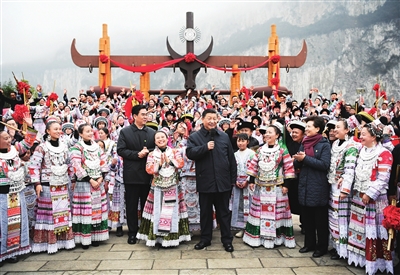 村文化广场上,乡亲们正在开展春节民俗活动,打起鼓、吹芦笙,载歌载舞,唱起了欢快的苗家迎客歌。看到总书记来了,大家齐声欢呼“总书记好”。习近平亲切地对乡亲们说,今年我们将迎来全面建成小康社会、实现第一个百年奋斗目标的伟大胜利。中华民族是个大家庭,五十六个民族五十六朵花。全面建成小康社会,一个民族不能落下;全面建设社会主义现代化,一个民族也不能落下。脱贫之后,要接续推进乡村振兴,加快推进农业农村现代化。希望乡亲们继续努力奋斗,把乡村产业发展得更好,把乡村建设得更美。临别时,乡亲们依依不舍簇拥着总书记,齐唱苗家留客歌,深情的歌声在乌江上空久久回荡。