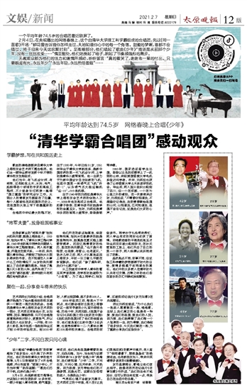 这个超级“学霸合唱团”的故事感染了很多观众,也引起了外界的关注。他们的母校清华大学的官方微博,2月5日连续转发了4次合唱视频,并分别留言:“皓首少年心,不负当年情”“热泪盈眶!”“愿我们历尽千帆,归来仍是少年!”