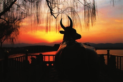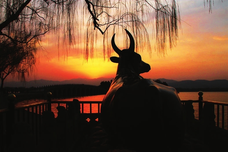 在颐和园昆明湖东堤岸上,十七孔桥桥头不远处,有一只神态生动、栩栩如生的铜牛,昂首安卧于岸边。颐和园铜牛,是我国古代拨蜡法铸造的代表作,我国古代雕刻,是以写意见长,这只铜牛,却用了写实的手法,它不仅造型生动,而且和周围环境融为一体。置于昆明湖岸,好似回首惊顾,若有所闻,注视着西北方向。自若的神态,逼真的造型,反映了我国古代高超的铸造艺术水平,是我国现存最大的古代铜牛,也是颐和园一道独特的人文景观和艺术珍品。