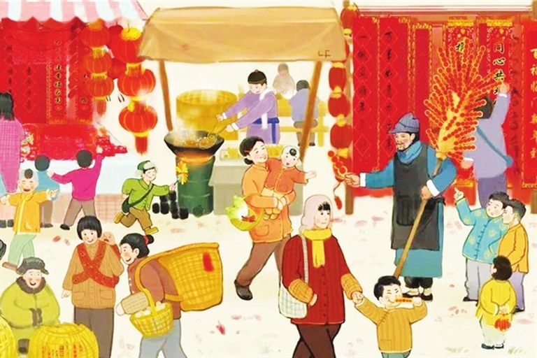大人们要早早地打扫院子,收拾屋子,制作年糕和折饼。折饼是糜子脱壳后磨成面粉,用鏊子摊成的饼,也叫黄儿,一张圆饼对折起来,即为折饼。从腊月二十八开始,迎春的气氛就更浓了。因为这天村里要赶年集,十里八乡的人都要来购买年货。头天晚上,母亲总要让我们早早地脱下旧棉衣,烧几大盆热水,让我们洗澡、泡脚。然后从柜子中取出新买的鞋子、袜子,以及城里伯母用缝纫机给我们做的新褂子、新裤子。我们挨个儿试着新衣服。裤腿长的,再往短改一改。没缀扣子的,要一针一线缝上。衣服打皱的,也要烧热烙铁熨得平展展的。