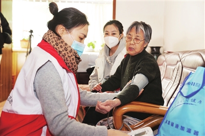 另一队志愿者前往86岁的空巢老人鲁阿姨家,老人的子女在国外,春节没法回来陪她过年。志愿者上门,老人感动得热泪盈眶,志愿者送来春联和福字,并帮她张贴好,还陪她拉家常,帮她打扫家。临走时,志愿者还帮老人测量了血压,叮嘱她注意疫情防控。
