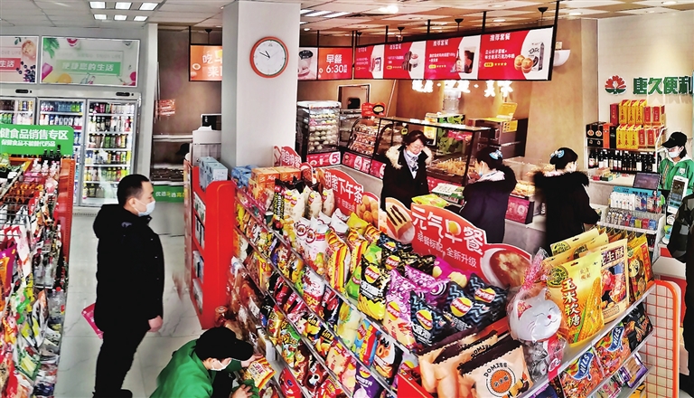 2月9日,唐久超市里,市民在选购商品。目前,唐久拥有完善的供应链体系,通过现代化物流配送中心,将安全健康的商品配送到全市。每日服务顾客约35万人次。 牛晨阳 摄