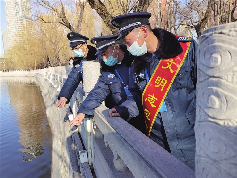 上午9时50分,太原保安服务有限公司城管分公司三大队(迎泽公园大队)队员,58岁的石宏滨,刚刚到达公园七孔桥附近的执勤点,他将在10时整替换同事,开始执勤。上午时分,暖暖的阳光照在身上,非常舒服。公园里,游人逐渐多了起来。