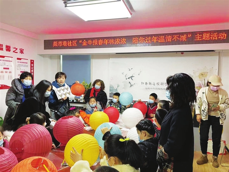 当日上午,柴市巷社区活动室内,社区找来的专业老师向小朋友们介绍了春联、灯笼的来历,还给每个小朋友发放了制作灯笼的材料,并详细讲解了如何装饰和放灯。孩子们在家长的帮助下认真思考,发挥想象,制作出一个个颜色多样、充满童真童趣的灯笼。