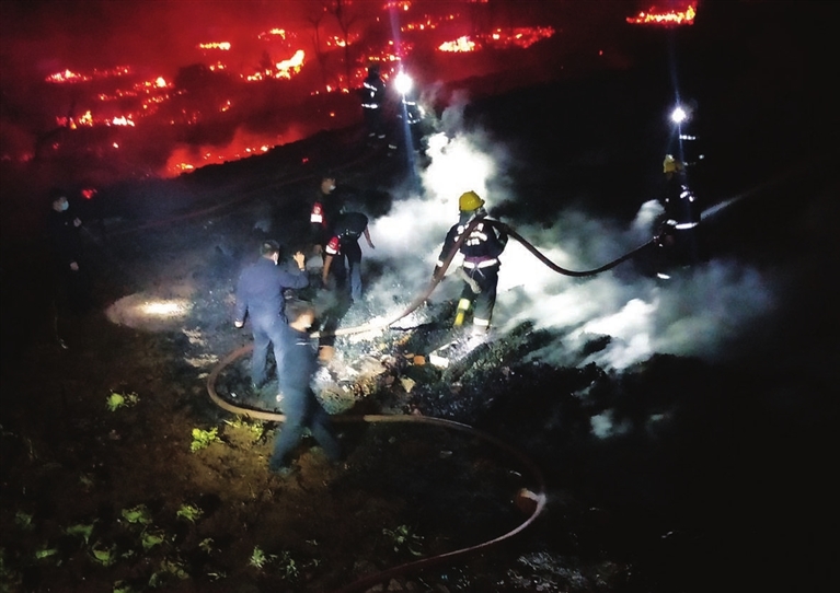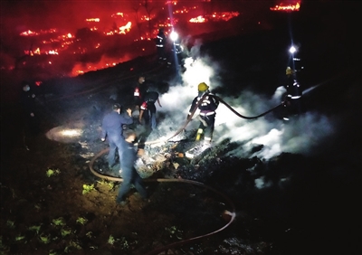 2月14日,消防人员在云南翁丁老寨火灾现场扑救。
