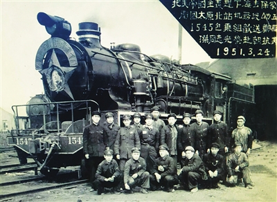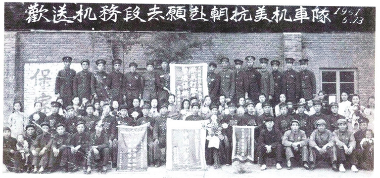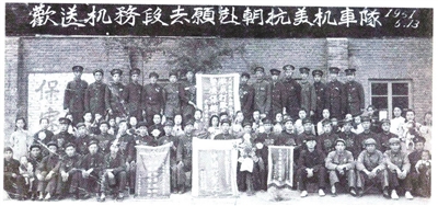 《跨过鸭绿江》掀起收视热潮,央视八套春节期间又在重播。笔者手头有一幅泛黄有些模糊的当年大同机务段火车司机赴朝参战出发前的合影照。照片上方有文字标明:“志愿赴朝抗美机车队1951.6.13”。照片中有十多名胸佩红花的火车司机和几名胸佩红花的女子,这些女子估计是奔赴前线的火车司机家属。照片中还有抱在父母怀中的孩子。四面锦旗在照片中间非常醒目,充分显示了这一机务段人员的技术素质和精神面貌。