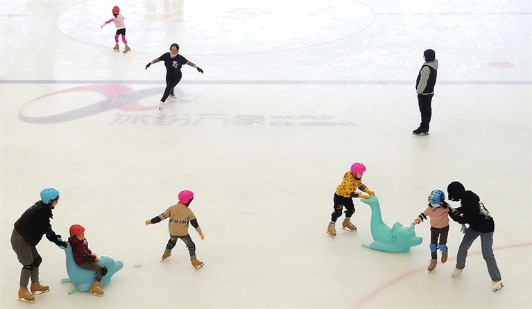 2月20日,太原万象城冰场,孩子们在家人的陪同下滑冰。据了解,在做好疫情防护的基础上,许多中小学学生通过参加滑冰等健身活动,度过快乐寒假。