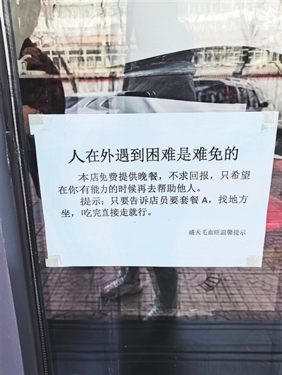 “我怕有些顾客不好意思,就设置了‘套餐A’这样一个‘暗号’,贴在橱窗的角落里,让有困难的人不必在公共场合表明身份,就能吃上热乎饭。‘温馨提示’张贴以来,没有人故意上门蹭吃蹭喝,更没有人上门捣乱,大家都在小心翼翼地保护着这份爱。”邢先生说,他和爱人做了十几年的餐饮,给困难的人提供一顿热乎乎的晚饭,经济上是完全能够承受的,实属举手之劳,也为之感到快乐。只要店面开下去,就会一直坚持做下去。同时也希望受到帮助的人,把这份正能量传递出去,让更多的人感受到温暖。