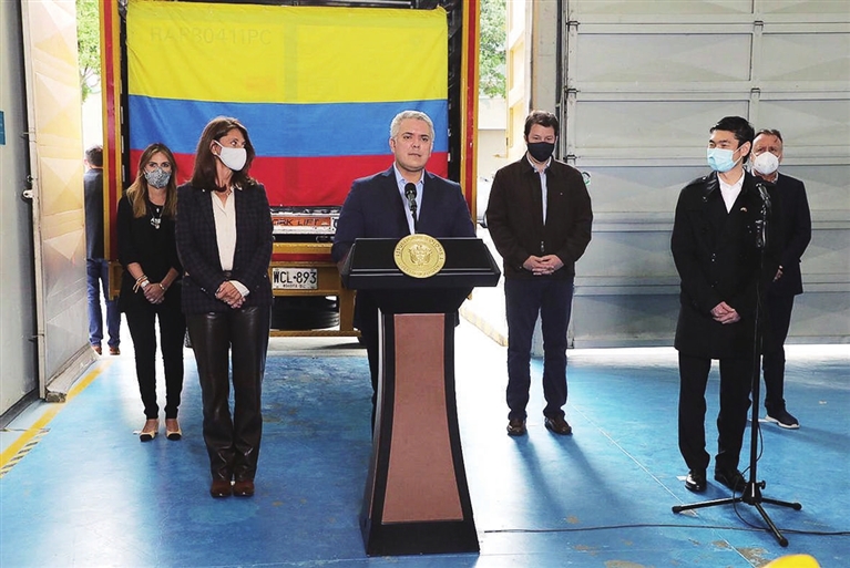 20日下午,首批由中国科兴公司生产的新冠疫苗运抵哥伦比亚首都波哥大。哥总统杜克在疫苗接收现场举行的新闻发布会上表示,哥中两国通力合作确保疫苗快速抵达,让哥伦比亚“欢欣鼓舞”,这批疫苗将挽救更多人生命。