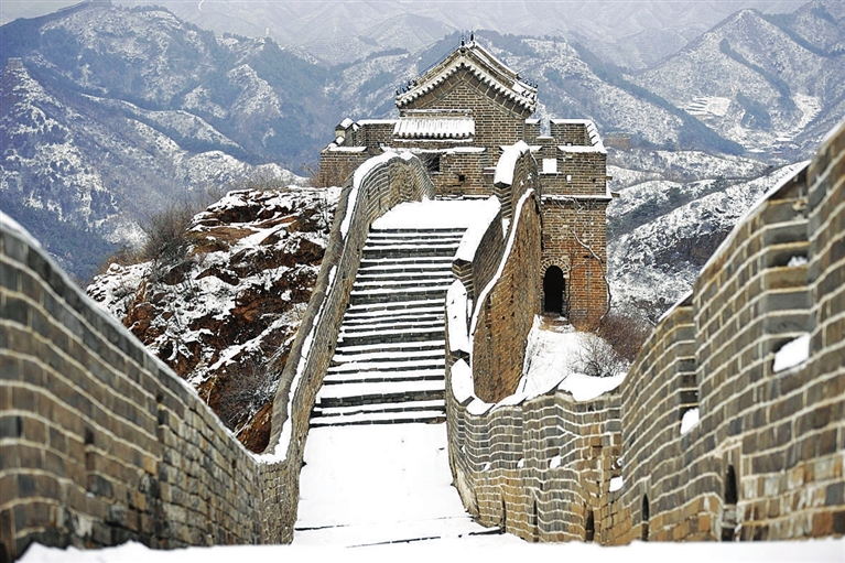 受冷空气影响,河北省承德市滦平县当日出现降雪天气。雪后的金山岭长城银装素裹,美如画卷。