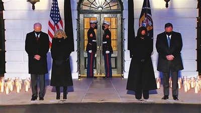 美国白宫22日傍晚举行烛光仪式,悼念50万名死于新冠疫情的美国人。随着夜幕降临,白宫南门廊和两侧楼梯上,燃起500支白色蜡烛,寒风中闪烁如点点泪光。美国总统拜登夫妇和副总统哈里斯夫妇戴黑色口罩,穿黑色服装,在海军陆战队乐队演奏的《奇异恩典》乐声中肃立默哀。默哀前,拜登发表讲话,呼吁美国民众共同悼念这些“独自咽下最后一口气”的人们。他说,逝者遍及各年龄层,他们的死亡是亲人“胸口的黑洞”。尽管疫情已持续很长时间,“但我们不能让自己对悲伤变得麻木不仁……必须抵制把每个生命看成一个统计数字、一种模糊概念,或者一桩新闻”。