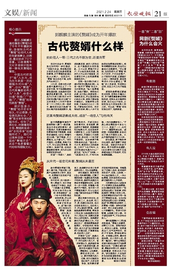 最近,郭麒麟主演的喜剧《赘婿》成了牛年开年爆款网剧,穿越到古代成“赘婿”的现代人帮助老婆搞事业、玩商战,最后还成了江宁首富。记者请青年文化学者侯印国来聊一聊有关赘婿的掌故。