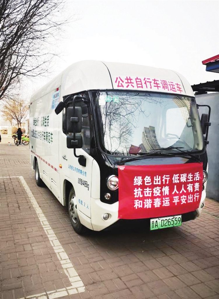 当天上午,记者在大同路太原公共自行车公司“公车点”旁,发现一辆工作中的纯电动公共自行车调运车。新调运车整体为白色,比以前的旧车体积小,前挡风玻璃上的“公共自行车调运车”8个红色大字非常醒目。
