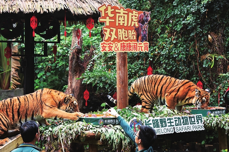 当日,广州长隆野生动物世界的华南虎双胞胎兄弟安安和康康吃上饲养员为它们特制的“肉汤圆”,欢欢喜喜“闹元宵”。长隆野生动物世界早前在广东清远建立“华南虎繁育及野化训练基地”,2020年6月成功繁育出华南虎双胞胎,为华南虎繁育保育积累了宝贵经验。 新华社 发