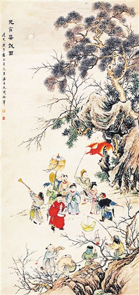 清代画家赵之琛、顾驺于1840年联合创作的《元宵婴戏图》,洒金纸本设色,纵134.5厘米,横63.5厘米,描绘的是一群儿童元宵节闹社火的民俗风情。画面的背景,奇石峭立,松柏参天,青竹苍翠;前面的坡石晕染出的纹路显得石质坚韧,石面上青苔点缀自然,山石旁的树枝枯涩古拙;天空云彩斑驳,明月高悬。画面的主题是一群活泼可爱的儿童载歌载舞欢度元宵,有的敲锣打鼓,有的吹唢呐或螺号,有的“骑驴”,有的挑着各式花灯,神态各异,惟妙惟肖。还有的儿童尽管装扮成老者和青壮年,可是难掩一脸稚气,天真烂漫。整个画面场景热烈,红火吉祥。观此图,不由得令人想起金代元好问七言绝句《京都元夕》:“袨服华妆着处逢,六街灯火闹儿童。长衫我亦何为者,也在游人笑语中。”