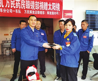 随着气温逐渐升高,阳光也越来越强烈,公交驾驶员每天长时间驾车在路上行驶,刺眼的阳光确实给他们的日常工作带来不少困扰。得知公交驾驶员的烦恼后,3月29日下午,万民药房眼镜部的工作人员带着100多副偏光太阳镜,来到公交三公司一车队调度站,向公交驾驶员表达慰问和敬意。车队则向爱心企业回赠了牌匾。