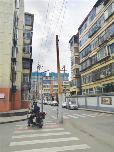 据附近居民介绍,以前这两根电线杆在便道上,三年前道路改造后,这两根电线杆便突了出来。