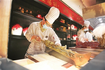 走进南中环杏花堂店,首先映入眼帘的是一口一米多长的“青龙偃月刀”。大刀置于精心雕刻的古色古香的架子上,气势不凡。午时将近,面点师开始和面、擀面,全程手工操作。一切就绪,面点师将刀从架上取下,重达28斤的大刀在师傅的手中快速起落,刀刃过处,便是齐整均匀的面条。