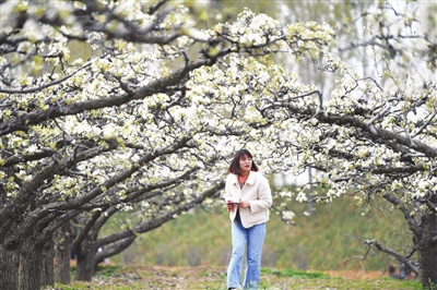 4月5日,游客在雄安新区雄县雄州镇马蹄湾村梨园观赏游玩。