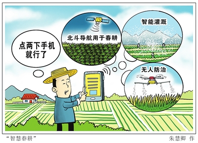 无人驾驶智能插秧机、智能化叶龄诊断、智能化浸种催芽、智能化控制灌溉……记者近日走访黑龙江、山东、湖南、安徽等部分粮食主产区,“智慧春耕”让地变“聪明”人变“懒”,手机成新农具,有的种粮大户成了“按一下按钮”“点两下手机”的“配角”。 (中国日报网4月6日)