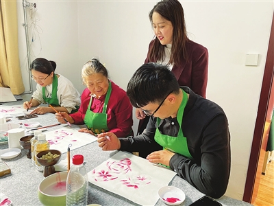 合唱结束,大家又开始学习国画,社区请来的国画老师以活泼生动的语言,生动地介绍了国画创作的基本步骤、调墨方法,引领大家领略国画的魅力。