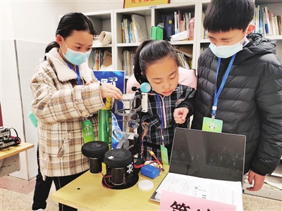 太原理工大学附属小学的3名学生朱紫瑶、申渝雯、李明正带来了智能语音控制的羽毛球陪练机器人。