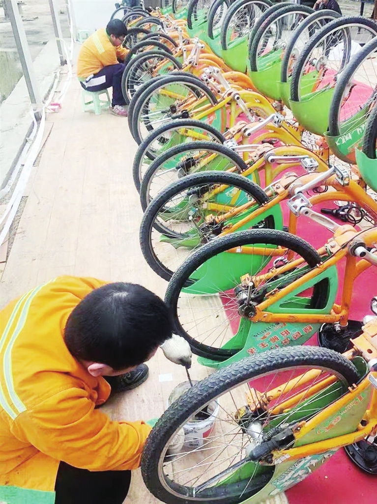 太原公交公共自行车公司工作人员介绍,和往年集中保养不同,今年采取分散保养的方式,三个修理工组成一个保养小组,在“公车点”巡查保养,这样不仅能降低调运压力,还能提高保养效率,节约成本。