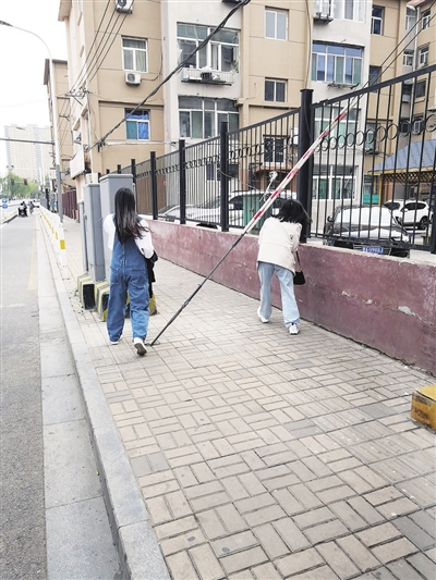 采访中,记者看到有三名路人由此经过。由于钢索挡路,其中一人不得不从非机动车道绕行,而另外两人则弯腰低头从钢索下穿过,看着十分不方便。