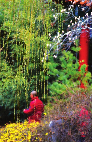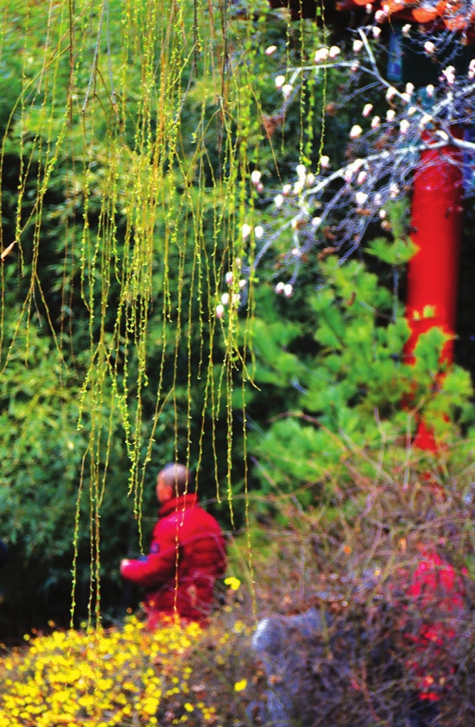含苞欲放的玉兰,婆娑的绿柳,怒放的迎春,翠绿的马尾松,如织的游人,一切昭示着春天来了。